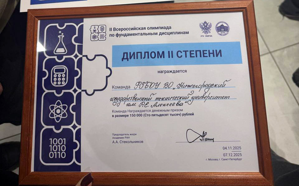 Команда Нижегородского государственного технического университета им. Р.Е. Алексеева успешно выступила в финале II Всероссийской студенческой олимпиады и получила диплом второй степени, подтвердив свою конкурентоспособность на всероссийском уровне.