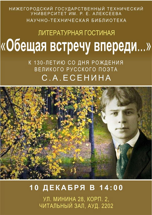 10 декабря в 14:00 библиотека университета (ауд. 2202) приглашает в Литературную гостиную «Обещая встречу впереди…», приуроченную к 130-летию со дня рождения великого русского поэта Сергея Есенина.