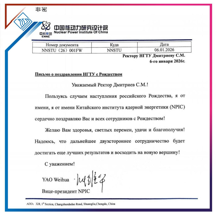 Вице-президент Китайского института ядерной энергетики (NPIC) Яо Вэйхуа направил тёплое поздравительное письмо ректору НГТУ им. Р.Е. Алексеева Сергею Дмитриеву и всему коллективу университета.