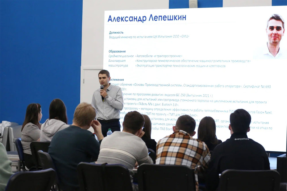 Перед студентами выступили сотрудники ООО «Объединенный инженерный центр» Горьковского автозавода – выпускники НГТУ: ведущий инженер по испытаниям ЦК Испытания Александр Лепешкин и руководитель ЦК Электроплатформы Михаил Панфилов. Они поделились с ребятами историями своих карьерных успехов на заводе.