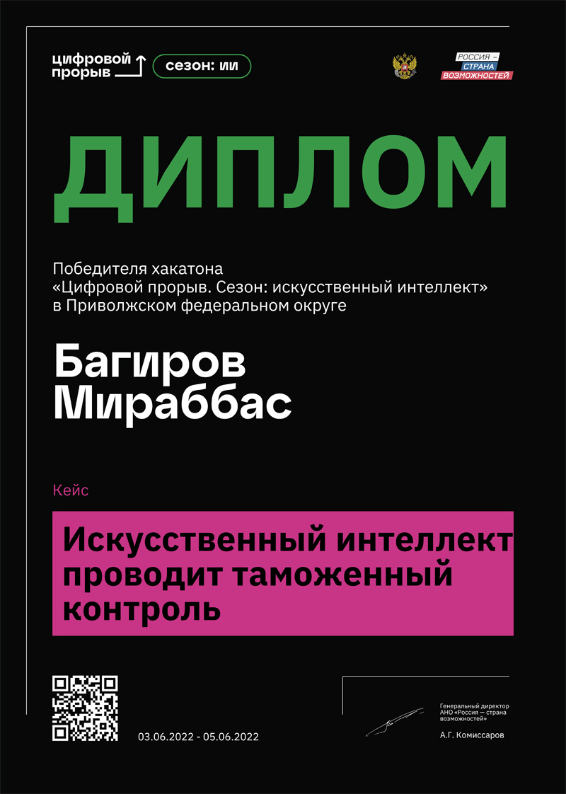 В кейсе «Искусственный интеллект ведет таможенный контроль» победу одержала команда «НЕЙМАРК», в состав которой вошли: Мираббас Багиров, руководитель «НЕЙМАРК. Школа хакатонщиков», преподаватель кафедры «Информатика и системы управления» НГТУ им. Р.Е. Алексеева, Тимофей Карклин, Татьяна Бородина, менторы «НЕЙМАРК. Школа хакатонщиков», студенты НГТУ им. Р.Е. Алексеева и Евгений Васильев, студент ННГУ им. Н.И. Лобачевского.