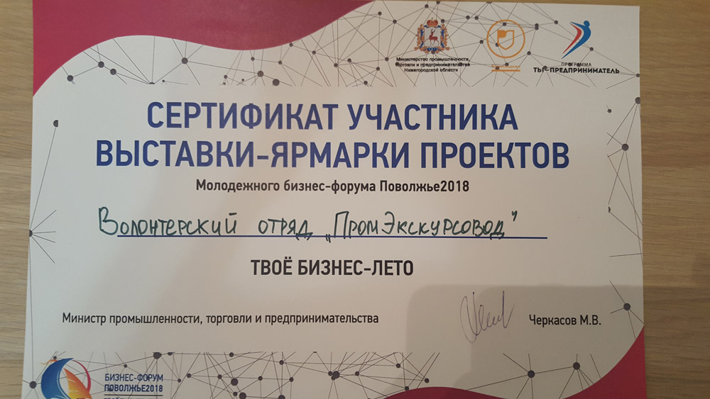 Волонтерский отряд «Промэкскурсовод» НГТУ им. Р.Е. Алексеева, созданный на базе Регионального центра просветительства, культурного и исторического наследия в рамках реализации Программы развития опорного вуза, принял участие в молодежном бизнес-форуме Нижегородской области «Поволжье-2018», проходившем 29-31 августа 2018 года.