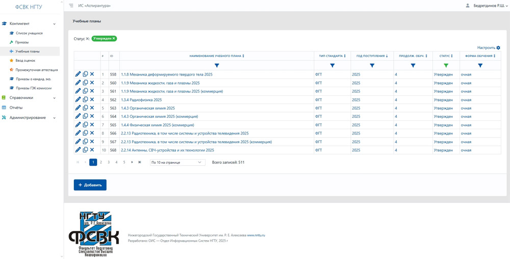 Информационная система включает в себя список обучающихся и их данные, информацию об успеваемости, архив выпускников и отчисленных, базы данных с научными руководителями, кафедрами и учебными планами. Одним из главных преимуществ новой системы является ее гибкость и адаптивность. Она учитывает особенности подготовки научных и научно-педагогических кадров в аспирантуре и может интегрироваться со сторонними информационными системами и сервисами.