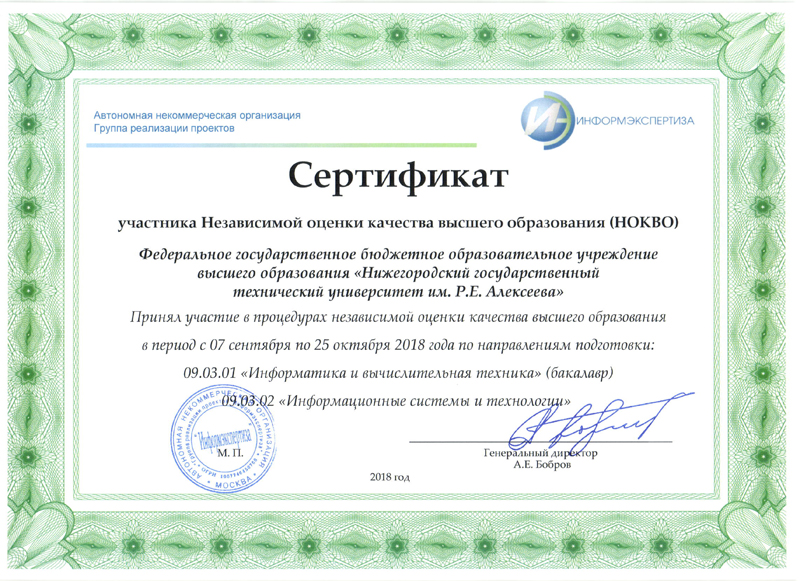 Нижегородский государственный технический университет им. Р.Е. Алексеева принял участие в реализации модели независимой оценки качества высшего образования. В итоге Автономная некоммерческая организация «Группа реализации проектов «Информэкспертиза» направила в адрес вуза сертификат участника НОКВО в 2018 году.