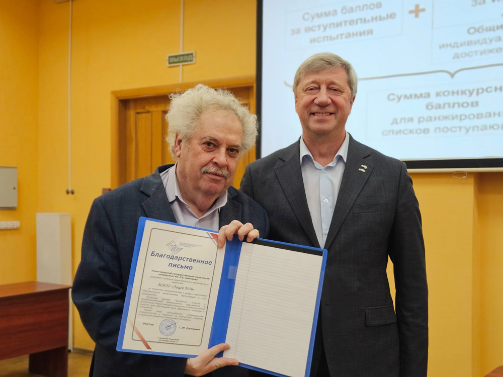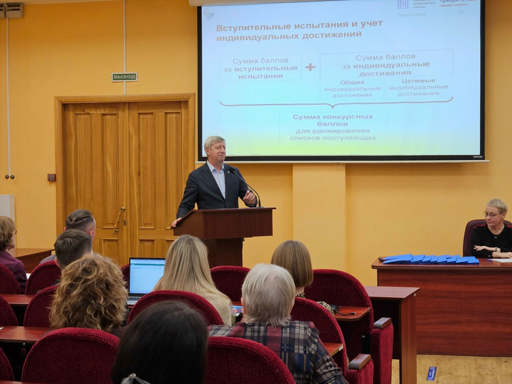 Приветствовал собравшихся первый проректор – проректор по образовательной деятельности Евгений Ивашкин. Он рассказал о деятельности университета и вручил от имени ректора НГТУ Сергея Дмитриева благодарственные письма руководителям образовательных учреждений, которые внесли наибольший вклад в приемную кампанию в 2025 году.