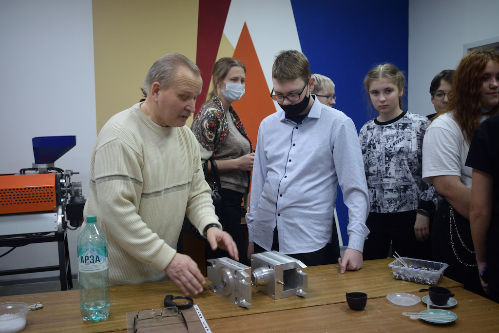 Старший преподаватель кафедры «Технологическое оборудование и транспортные системы» Виталий Коновалов познакомил гостей с оборудованием мастерской ресайклинга, рассказал о важности раздельного сбора и повторного использования пластиковых отходов. Преподаватель продемонстрировал ребятам весь цикл их переработки