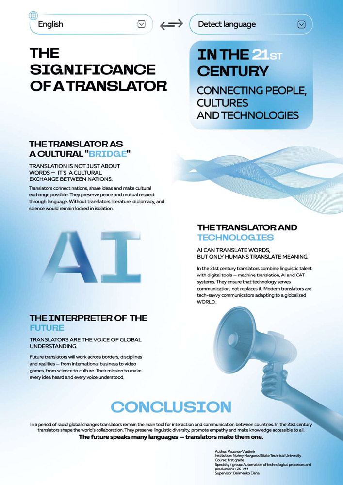 Участие в олимпиаде стало стимулом для ребят углубить знания иностранного языка как инструмента межкультурного взаимодействия. В своих конкурсных работах они продемонстрировали современный взгляд на переводческую деятельность в условиях цифровизации и уверенно заявили о профессиональном потенциале будущих специалистов.