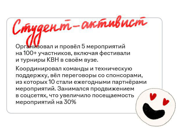 - Как говорить о себе, когда кажется, что «мне нечего написать», и превратить даже учёбу или волонтёрство в ценные достижения;