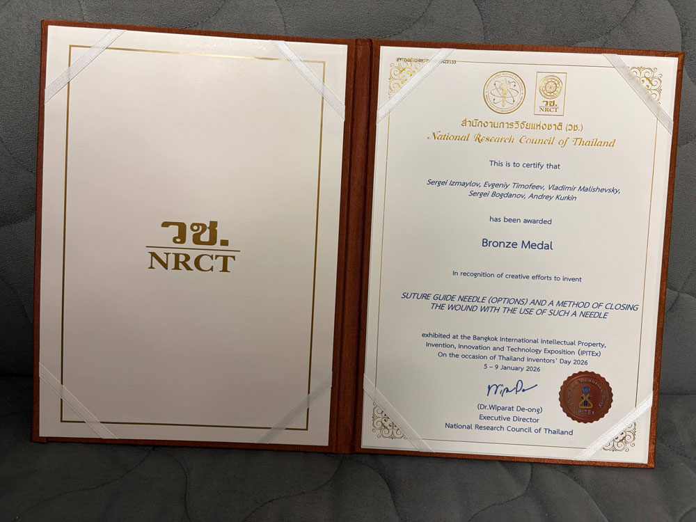 Диплом и бронзовая медаль вручены авторам разработки «Игла-кондуктор шовная (варианты) и способ ушивания раны, использующий такую иглу». Авторский коллектив проекта: Измайлов Сергей Геннадьевич, Тимофеев Евгений Петрович, Измайлов Александр Геннадьевич, Лукоянычев Егор Евгеньевич, Малишевский Владимир Федорович, Конашов Алексей Сергеевич, Богданов Сергей Николаевич, Абдулкеримов Эльдар Магомедшерифович, Мезинов Андрей Валерьевич, Богданов Никита Сергеевич, Самарин Евгений Вячеславович и Куркин Андрей Андреевич.