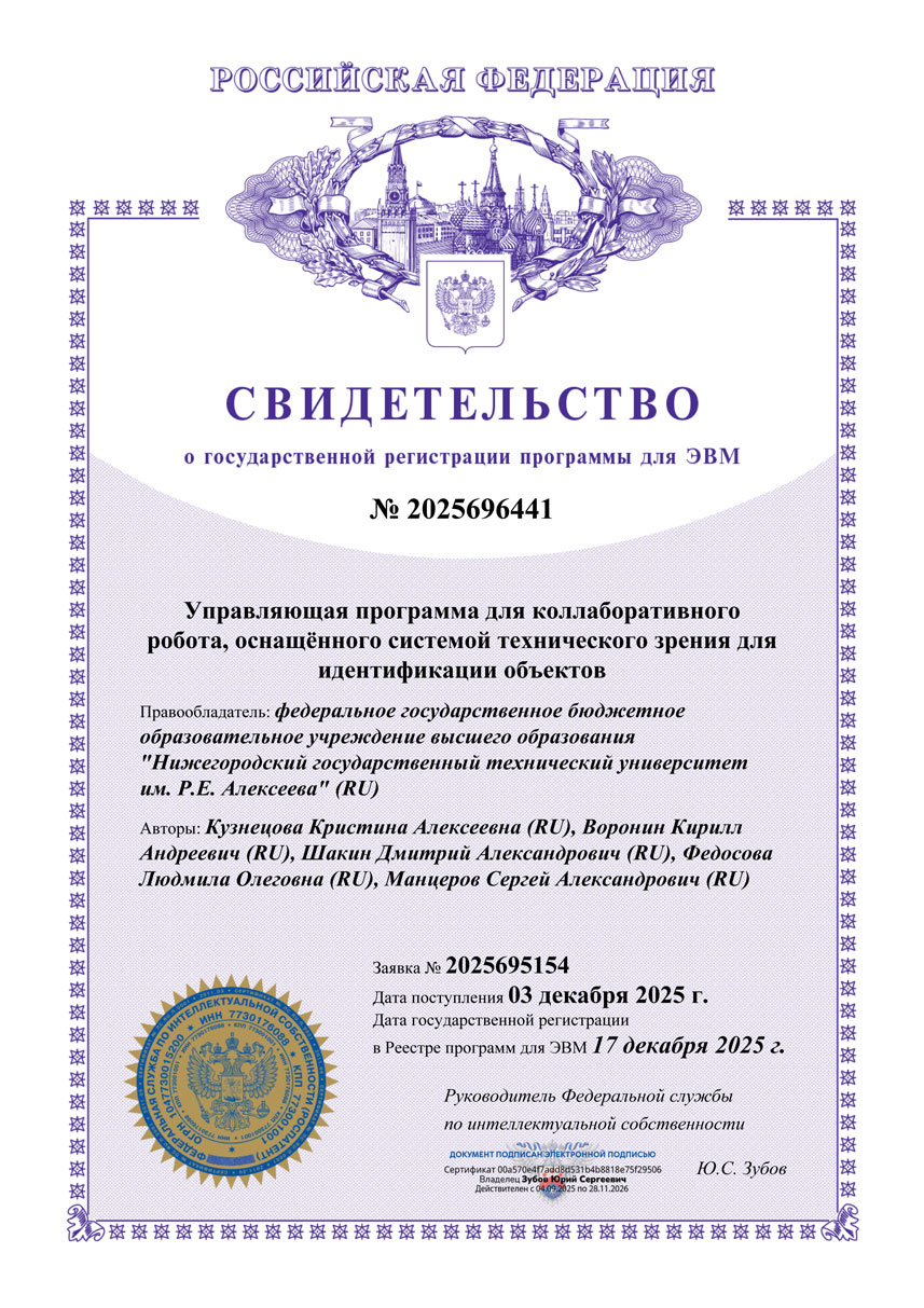 Федеральная служба по интеллектуальной собственности Российской Федерации выдала свидетельство о государственной регистрации программы для ЭВМ № 2025696537 «Программный комплекс управления захватным устройством промышленного робота», разработанной учеными Нижегородского государственного технического университета им. Р.Е. Алексеева (НГТУ).