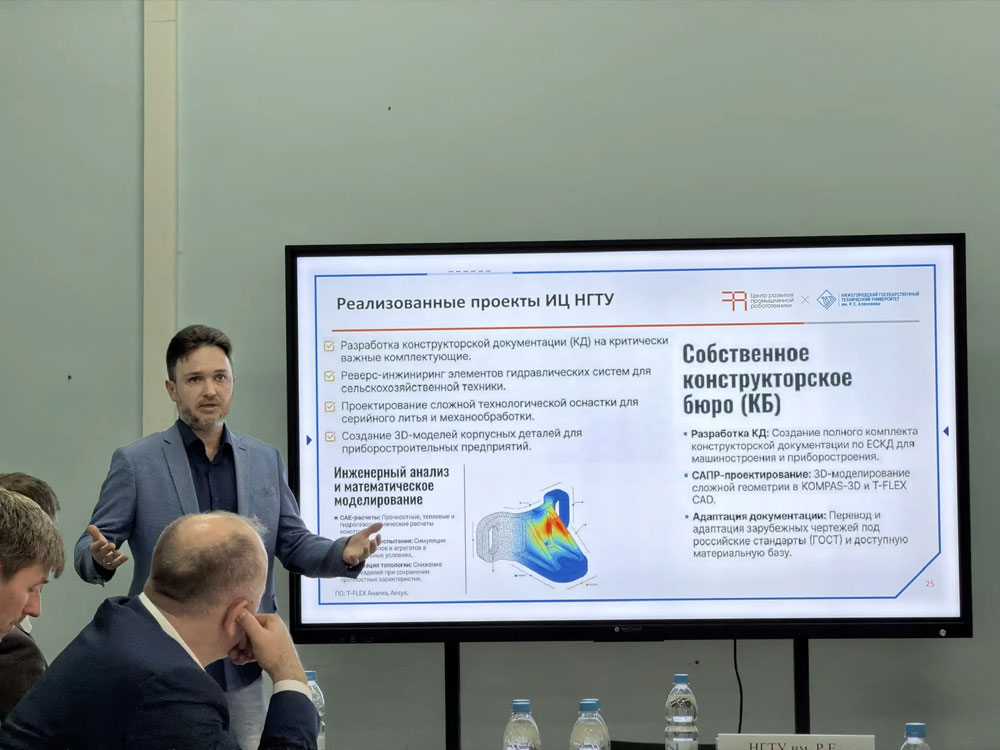 Директор Инжинирингового центра Сергей Иванов рассказал об инфраструктуре ИЦ и представил потенциальные проекты и выполненные работы по проектированию изделий, разработке конструкторской документации и изготовлению опытных и серийных образцов различной сложности.