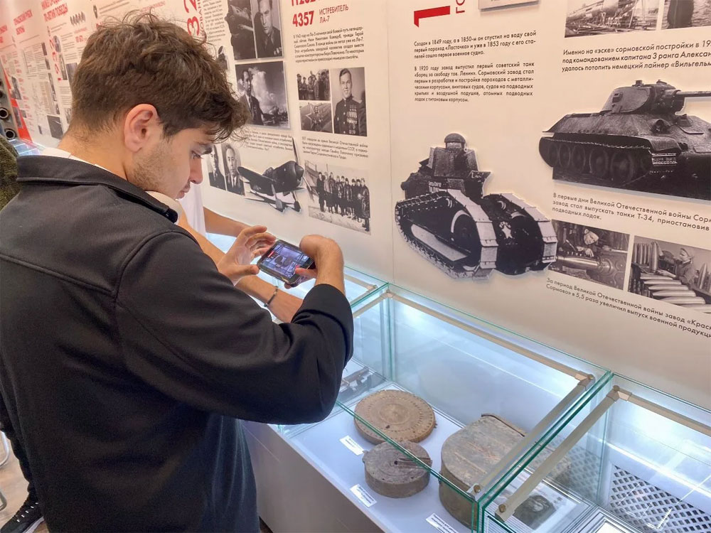 Обзорная экскурсия включала знакомство с самыми интересными экспонатами Великой Отечественной войны и послевоенного периода. Студенты внимательно рассматривали легендарный советский средний танк Т-34, противотанковую пушку 53 К калибра 45 мм («сорокопятку»), а также реактивную установку залпового огня БМ-13 («Катюша») на шасси грузового автомобиля ЗиС-151, машины пехоты и десанта, самолёты МиГ и многое другое.