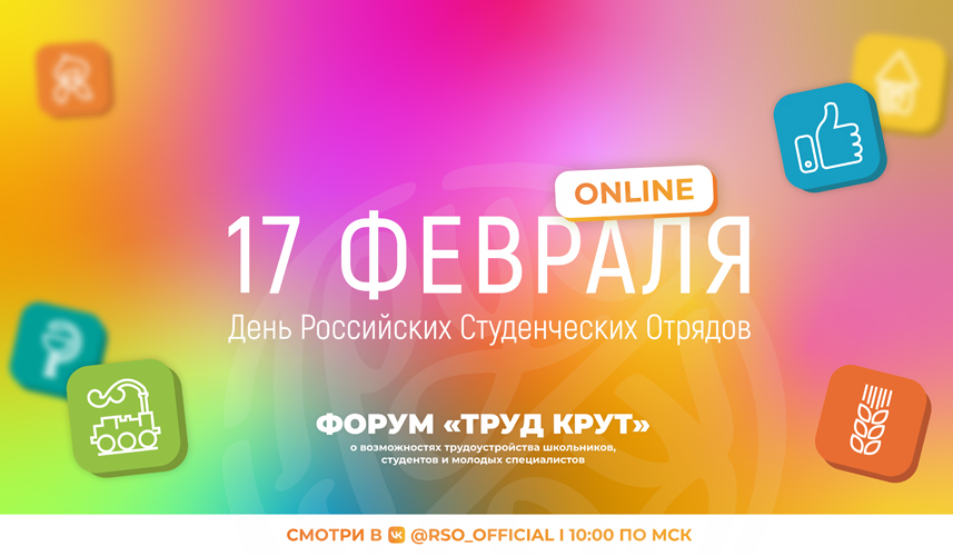 17 февраля 2022 года, в рамках государственного праздника Дня Российских студенческих отрядов состоится карьерный форум «Труд Крут». Он станет дискуссионной онлайн - площадкой, где представители государства, общественных организаций и крупнейших работодателей обсудят возможности трудоустройства школьников, студентов и молодых специалистов.