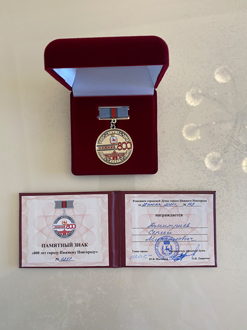 25 августа в Доме торжественных приемов (Усадьба Рукавишникова) состоялась церемония вручения памятных знаков «800 лет городу Нижнему Новгороду». Вручил награды председатель Городской думы Нижнего Новгорода Олег Лавричев.