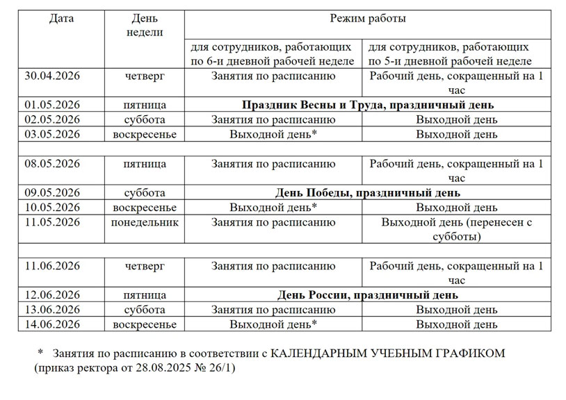 В документе указан режим работы для профессорско-преподавательского состава (ППС), учебно-вспомогательного персонала (УВП), сотрудников, обеспечивающих учебный процесс и работающих по шестидневной рабочей неделе, и другого персонала, работающего по пятидневке, в предпраздничные и праздничные дни.