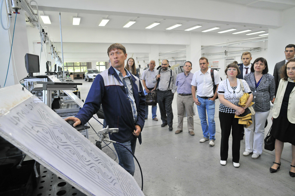 Перед началом заседания представители ЧОУ ДПО «Корпоративный университет «Группа ГАЗ» - Ирина Анатольевна Боголюбова, начальник центра управления знаниями «Корпоративный университет «Группа ГАЗ» и Алексей Иванович Наумов, старший тренер завода по производству автомобилей VW/Skoda - провели обзорную экскурсию по учебной площадке Корпоративного университета, где обучаются рабочим специальностям сотрудники ГАЗа и представители сторонних организаций. Участникам показали четыре основные образовательные площадки, соответствующие этапам производства: сборка, сварка, рихтовка и покраска. Обучение рабочих здесь проводится на базе современного оборудования и новейших учебных разработок одного из лидеров машиностроительной отрасли – компании Volgswagen.